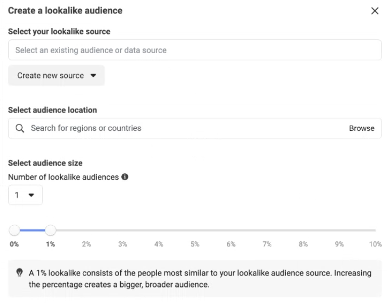 2. Select your Lookalike source (should already be pre-selected). Select your audience range (a 1% lookalike consists of the people who are most similar to your Lookalike Audience source. Increasing the percentage creates a bigger, broader audience):